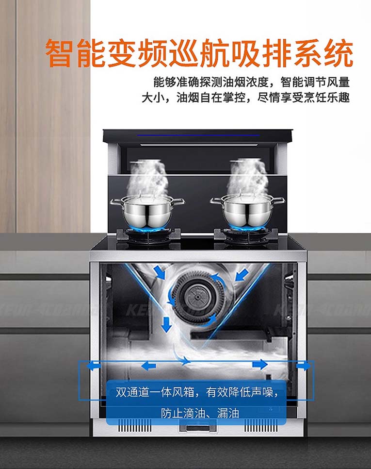 科恩D151X變頻大吸力集成灶功能實現多樣化,上炒下蒸烤能同時進行,蒸烤過程耗時短、效率高,噴氣式4D立體蒸技術保留了食物的原滋原味,采用智能變頻巡航吸排系統,能夠準確探測油煙濃度,智能調節風量大小,油煙自在掌控,最大幅度減輕油煙排出的阻力和熱量,排油煙更通暢、更高效、更徹底,油煙吸凈率更高,讓油煙無處可逃。