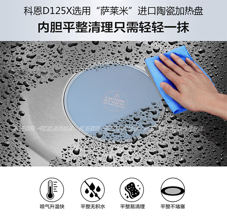 想要蒸出可口美味的菜,蒸箱就需要滿足“溫度高、蒸汽足”的條件,集成灶十大品牌、廚電行業十大品牌科恩蒸烤消一體集成灶采用噴氣式4D立體蒸技術,噴氣升溫快,360°立體循環蒸汽環繞,墻體溫度急速升高,熱風由內而外,迅速加熱內部難熟組織,蒸汽自外向內,將食物層層包裹,全方位滲透食材,激活新鮮口感,鎖住營養與美味,完美解決普通蒸箱蒸制食材太慢、營養流失、味道不鮮美等問題。另外,底部加熱盤采用進口陶瓷“薩萊米”技術,平整不積水、易清理、不堵塞,只需輕輕一擦就能潔凈。