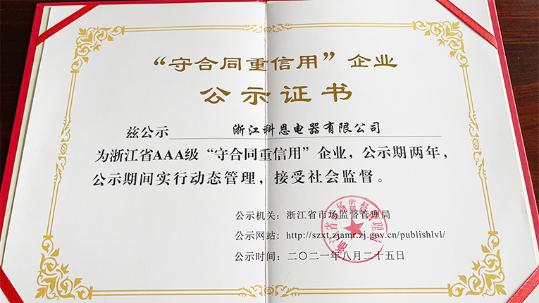 根據(jù)《浙江省“守合同重信用”企業(yè)公示辦法》規(guī)定,由企業(yè)自愿申報(bào)、系統(tǒng)自動(dòng)測(cè)評(píng)、各地核實(shí)推薦、大數(shù)據(jù)比對(duì)和雙隨機(jī)實(shí)地核查,2021年浙江省AAA級(jí)“守合同重信用”企業(yè)公示名單出爐,憑借著誠(chéng)信守法的“契約”精神,嚴(yán)謹(jǐn)規(guī)范的合同管理體系以及良好的經(jīng)營(yíng)效益,進(jìn)一步強(qiáng)化“守法”意識(shí)的浙江科恩電器有限公司榮獲浙江省AAA級(jí)“守合同重信用”榮譽(yù)。