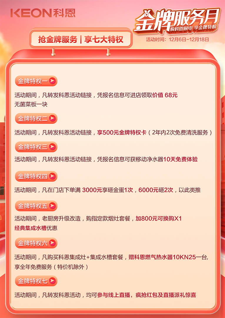 科恩“金牌服務月”經過精心籌備盛大開啟,購科恩廚電,享金牌特權!以領軍者姿態,開啟行業服務新典范。用戶不但可以通過科恩全國專賣店直接獲取服務,還可以通過線上報名、砍價形式獲得權益,結合線下門店金牌服務,聚焦客戶最及時服務需求,七大特權限時搶購!