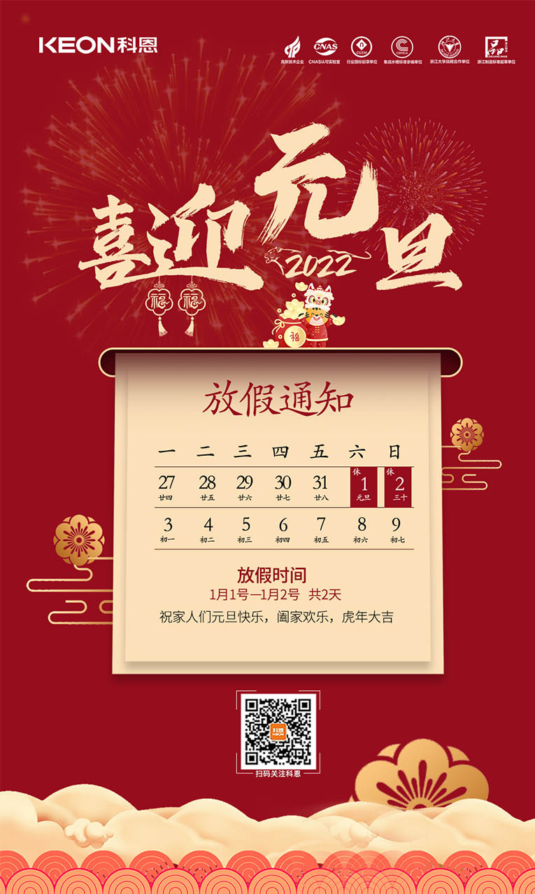 尊敬的全國(guó)科恩家人們:元旦將至,根據(jù)《國(guó)務(wù)院辦公廳公布2022年放假安排》,結(jié)合公司實(shí)際生產(chǎn)情況,科恩總部元旦放假安排通知如下: