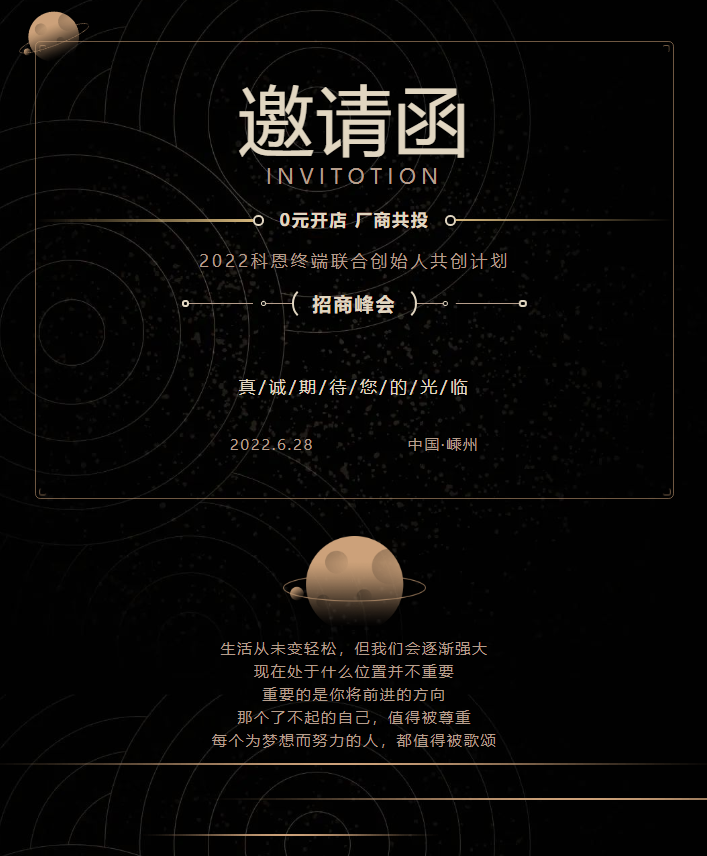 生活從未變輕松,但我們會逐漸強大,現在處于什么位置并不重要,重要的是你將前進的方向,那個了不起的自己,值得被尊重,每個為夢想而努力的人,都值得被歌頌!誠邀您參加2022年6月28日在浙江嵊州,由浙江科恩電器有限公司主辦的「0元開店,廠商共投」2022年科恩終端聯合創始人共創計劃暨招商峰會,并真誠期望我們于此次活動共享藍海市場商業機會的同時,商討雙方企業發展策略,共同揭開科恩集成灶品牌的神秘面紗。
