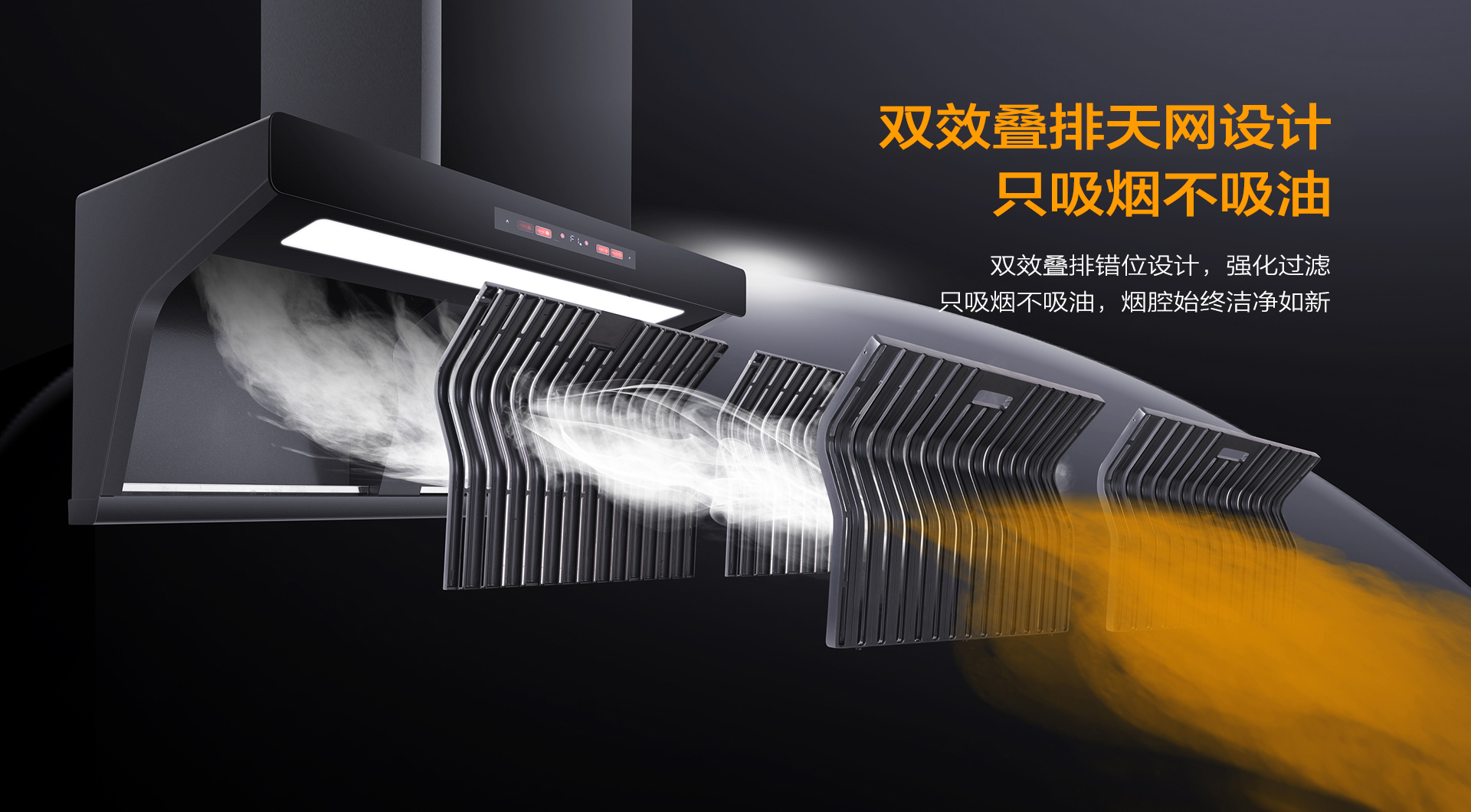 雙效疊排天網將油煙盡數隔離在外,真正做到只吸煙不吸油。徹底告別煙機清洗難題。煙機免拆洗,廚房更省心!