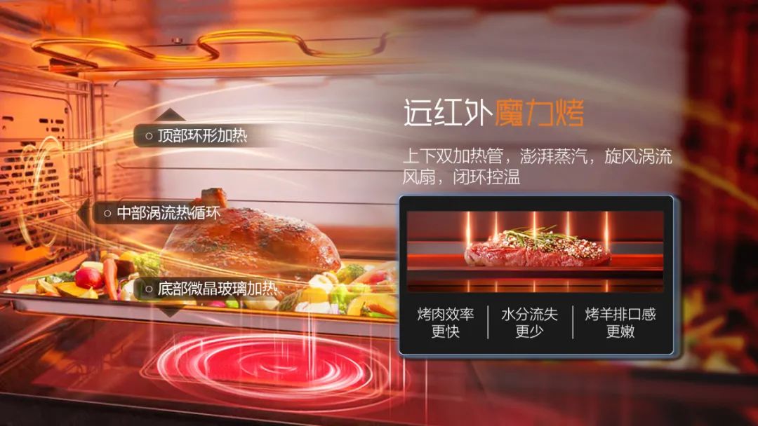遠紅外魔力烤:采用上下雙加熱管,澎湃蒸汽,旋風渦流風扇,閉環控溫。