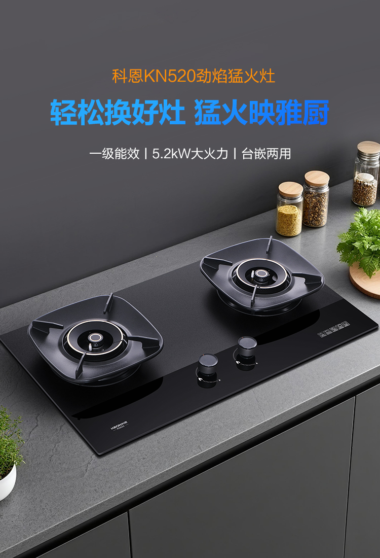免改煥新,秒換好灶。老舊灶具換裝難,拆改打孔費時間,科恩KN520臺嵌兩用,免改孔徑零門檻,黑色油砂納米面板,油污一擦即凈,高亮旋鈕防燙隔熱,指尖操作更安心。無需折騰舊廚房,煥新只需舉手間,讓老房廚房輕松升級無負(fù)擔(dān)。猛火寬域,味鮮效高。5.2kW三噴猛火,爆炒鎖鮮不留痕,0-170°無極調(diào)火,文火慢燉更入味。上銅下鋁火蓋設(shè)計,導(dǎo)熱均勻不夾生航空級鋁合金燃燒器,耐高溫不易變形,超70%新標(biāo)一級能效,省氣省錢減開支。猛火不費氣,家常也能出大廚味。易潔防爆,安全護(hù)航。可拆卸火蓋設(shè)計,深度清潔無死角。鋁合金爐頭防堵防銹,耐用十年依舊新,黑色啞光爐架聚能防風(fēng),火苗穩(wěn)定不跑偏。意外熄火即刻斷氣,湯汁溢出不慌神。防爆抗砸面板加持,廚房安全雙保險。烹飪無憂,健康呼吸伴三餐。